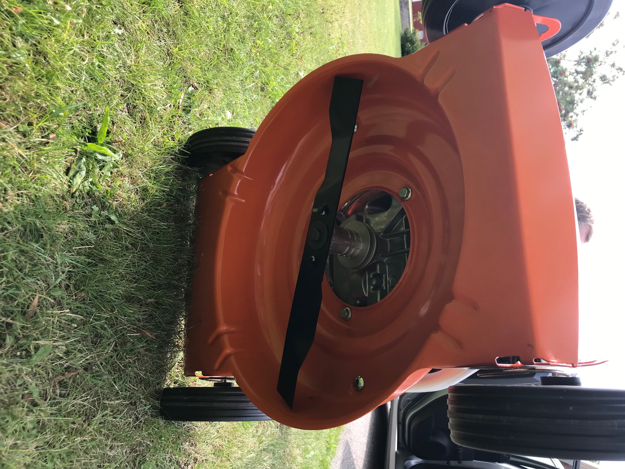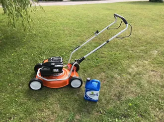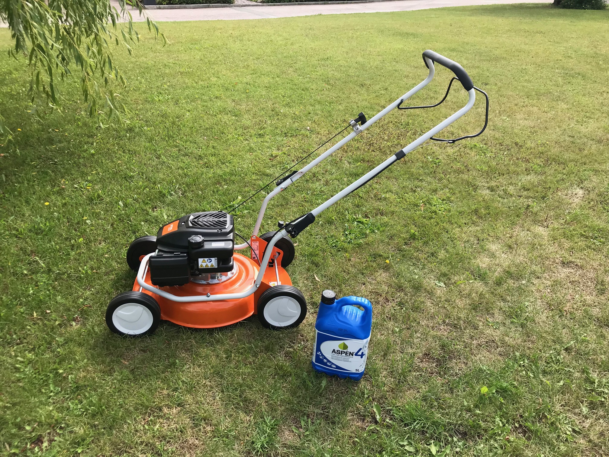 Nu har vi en ny klippare avsedd för föreningens gemensamma ytor. Den är lika enkel att köra som den gamla. Likt den gamla har den ingen drivning. Det är benkraft som gäller men klipparen är lätt. Den här är i plåt vilket gör det än viktigare med rengöring. Efter klippning ska den rengöras även på undersidan. Dra loss tändstiftskontakten innan rengöringen! Gör rent med en träpinne. Gräsklipparbensin kommer finnas i förrådet – säg till om det börjar ta slut. Se bilderna.
