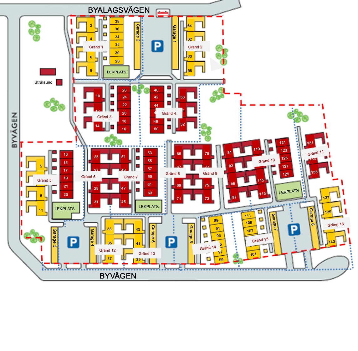 Fastigheterna: Byalagsvägen 40, 42, 44, 46, 48, 50, 52, 54, 56, 58, 60, 62 och 64.