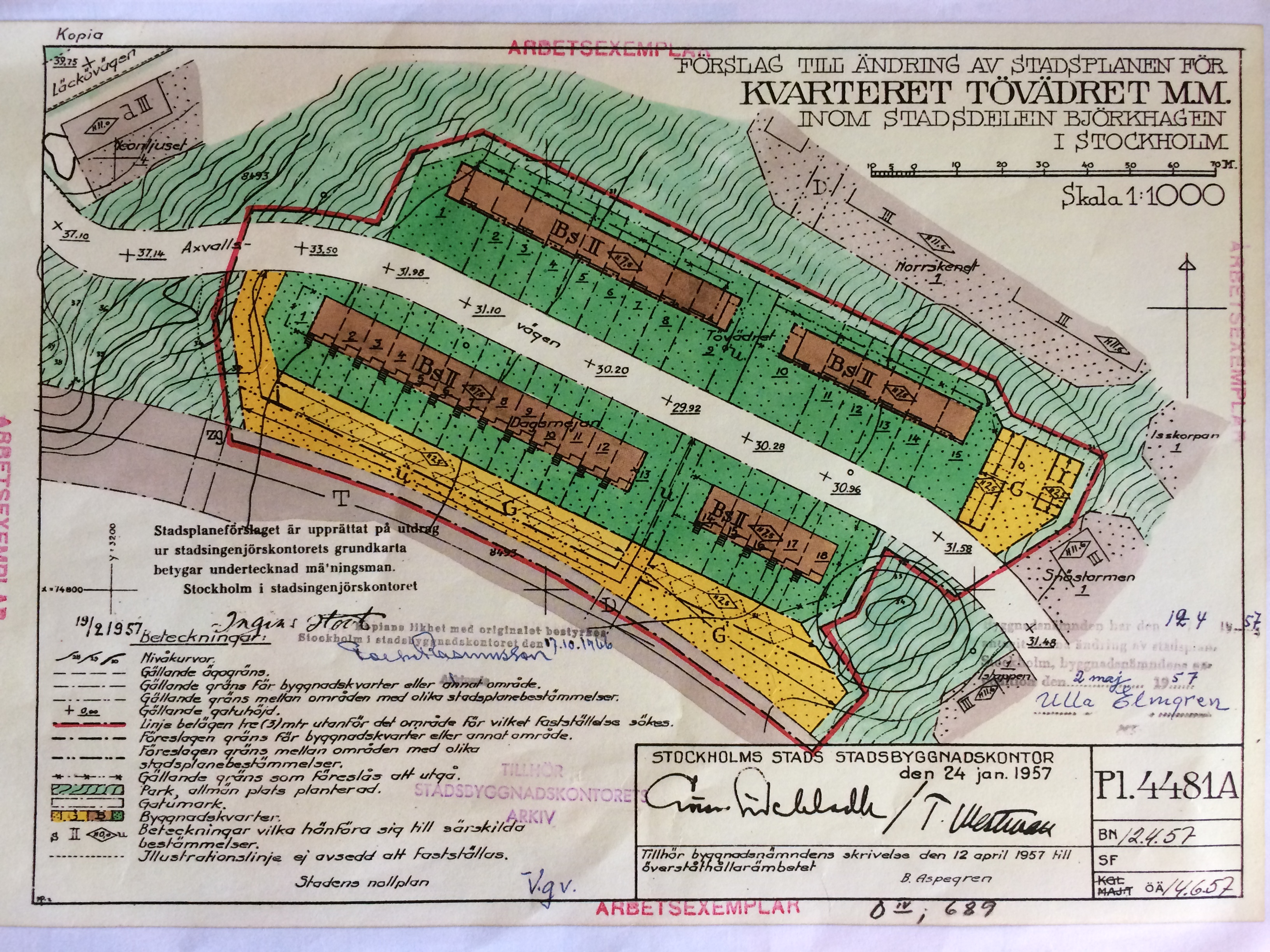 Fastighetskontoret inom dåvarande Småstugebyrån meddelade den 23 november 1949 byggnadslov att uppföra enfamiljs radhus.