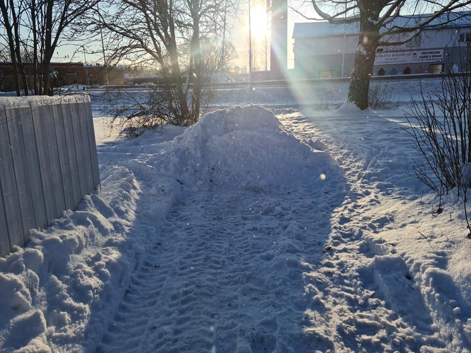 Info gällande snövallar som snöröjningsfirman skapar längst lilla gången mot cykel/gångbana Kalmarvägen.