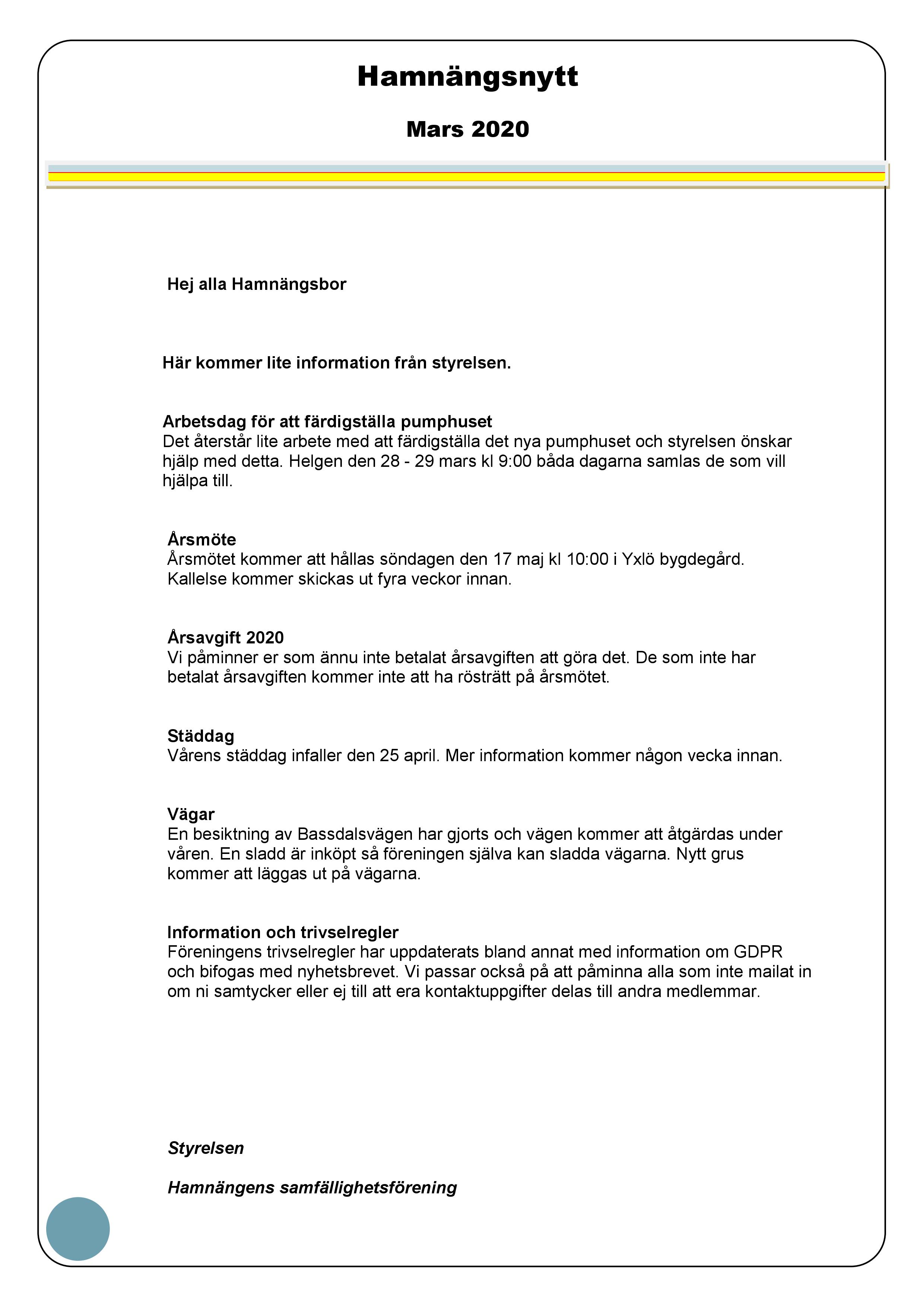 Hej alla Hamnängsbor! Här kommer lite information från styrelsen
