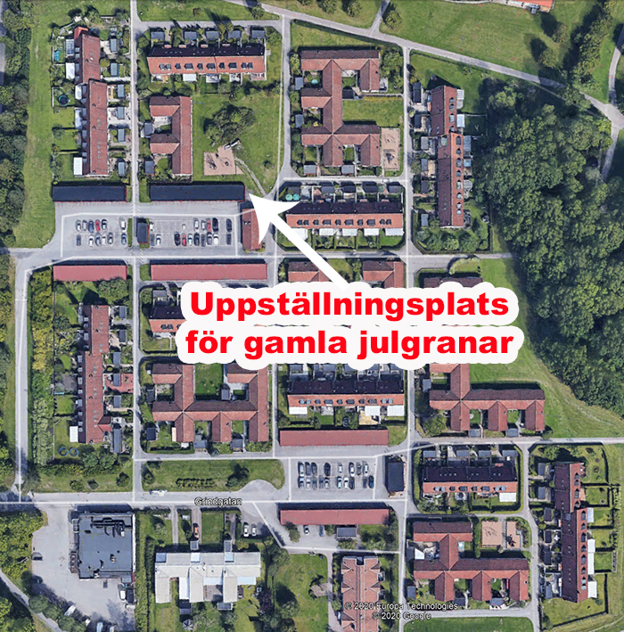 Vi har beställt hämtning från vårt område. Uppställningsställe blir vid platsen, där det tidigare fanns ett sopskjul, mitt emot R-husets gavelingång. Vi vet inte när hämtning sker hos oss, så därför måste granarna vara på plats vid ovanstående tidpunkt.