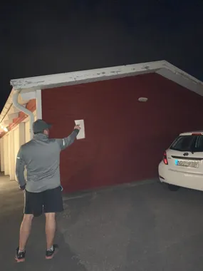 Det finns en lampanordning monterad på garagens kortsida. Mitt emot Aynur vid parkeringsplatsen på Mångatan. Den fungerar inte för tillfälligt, så om någon har tid att byta den vore det toppen. Det vore bra att ha en lampa som lyser på de parkerade bilarna.